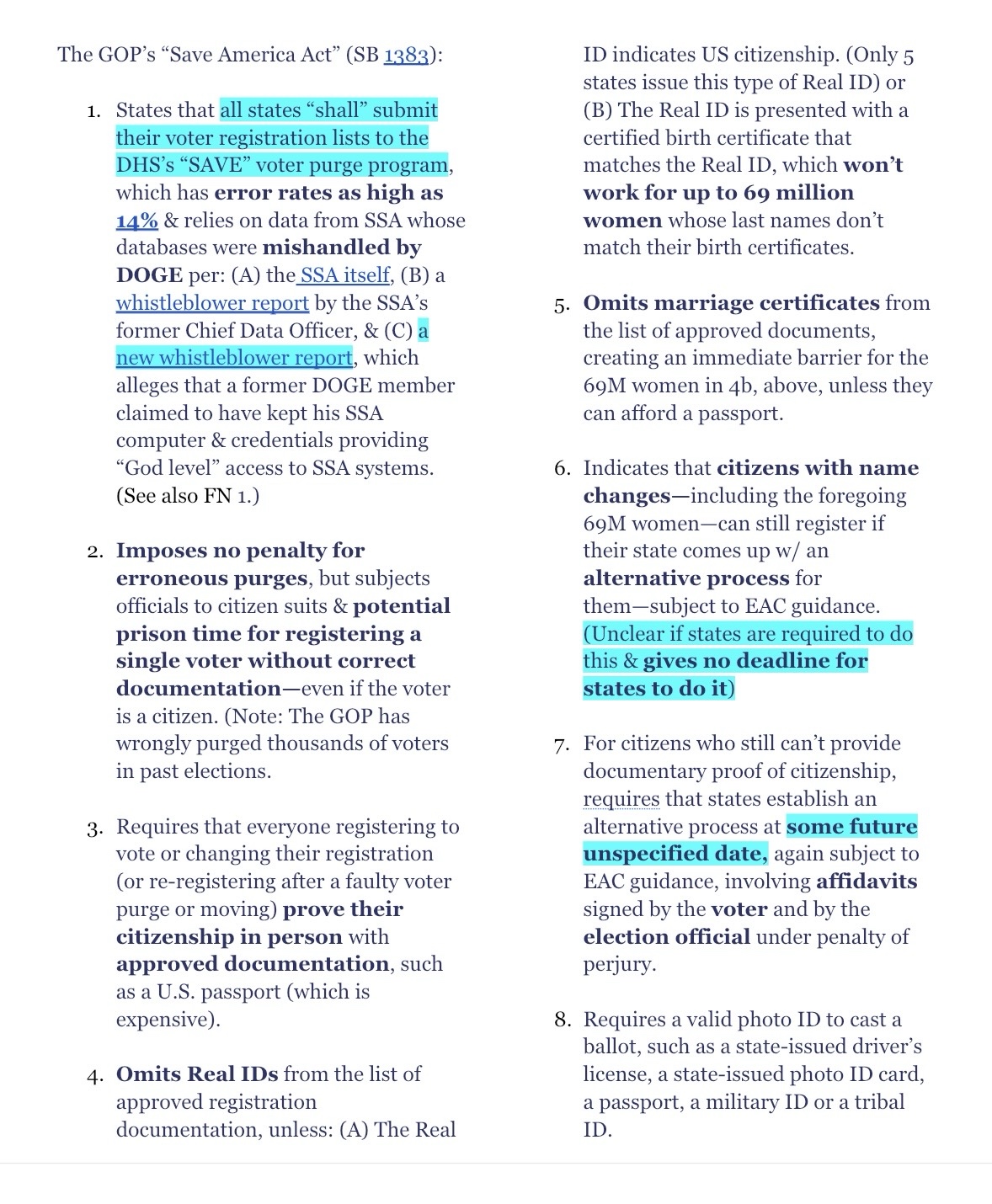 I read the “Save America Act,” so you don’t have to. Most of the media apparently *hasn’t* read it because, if they had, they would be sounding the alarm about the provision in Point 1, below, which almost none of them have even mentioned. I hope this summary helps raise awareness. 1/
