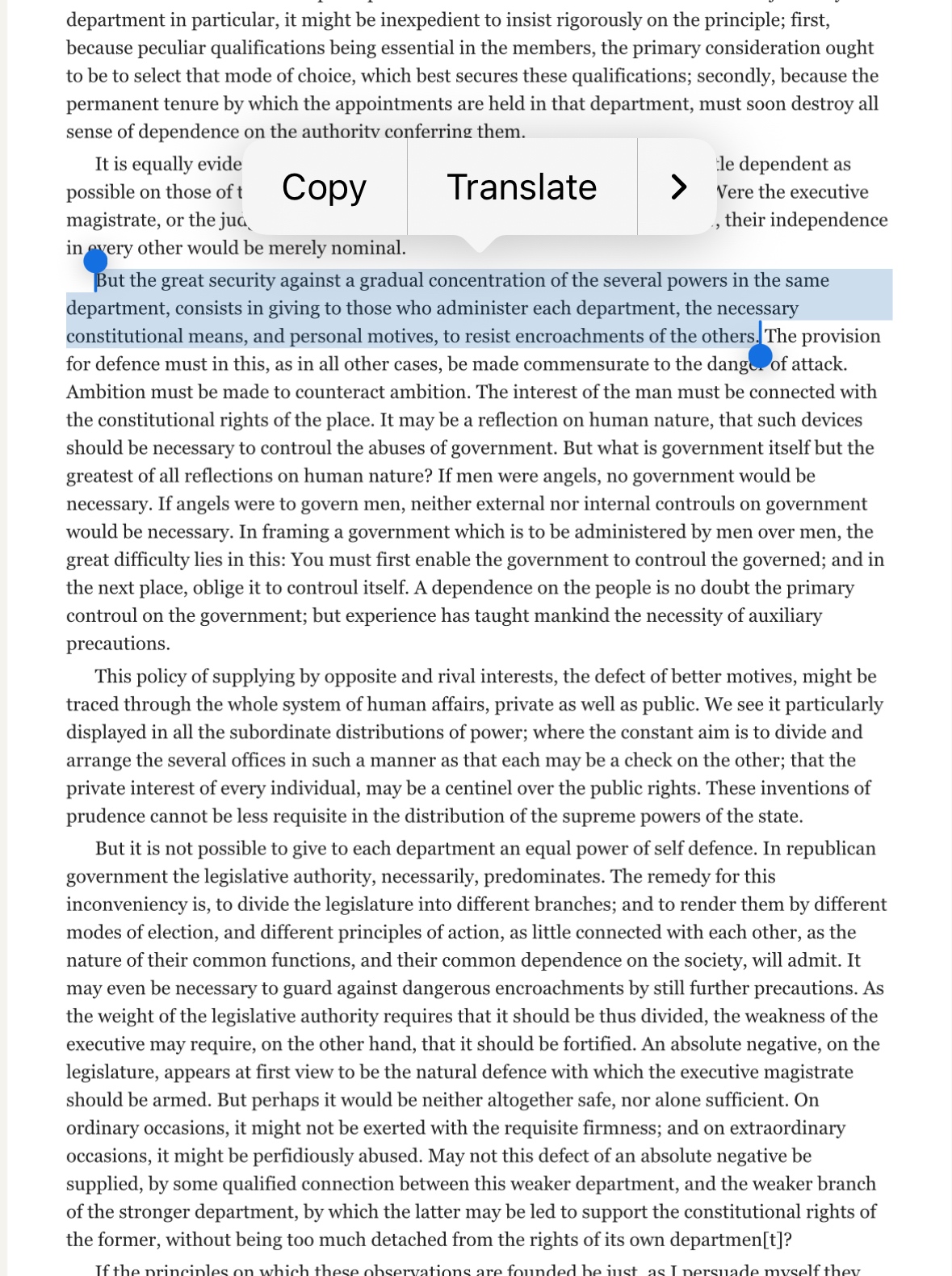 Federalist 51: “But the great security against a gradual concentration of the several powers in the same department, consists in giving to those who administer each department the necessary constitutional means and personal motives to resist encroachments of the others.”