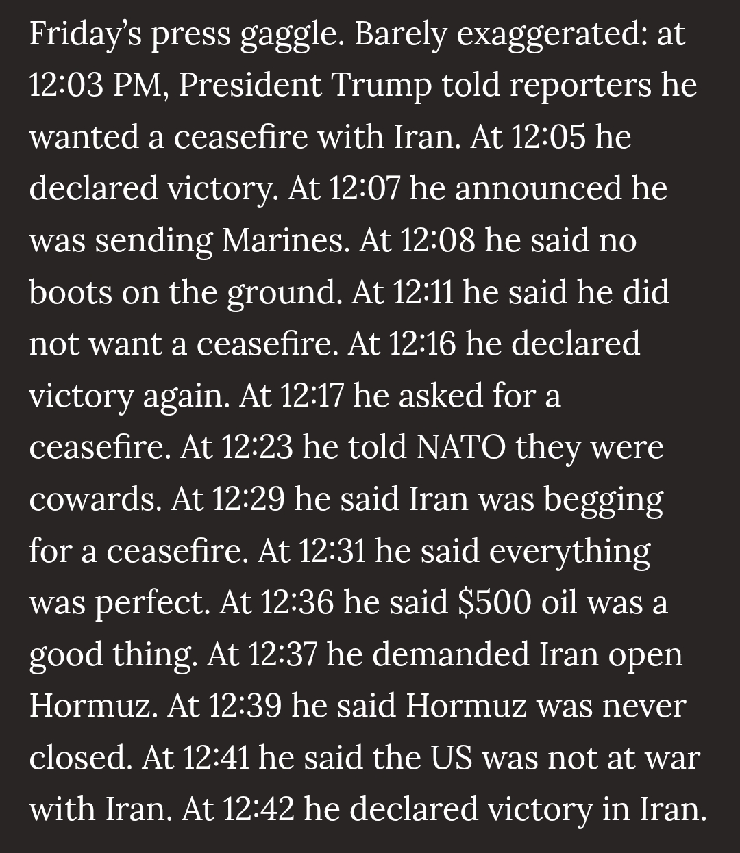 Trump’s pick to head FEMA didn’t know we had a hurricane season, his head of Homeland Security doesn’t know what habeas corpus is, his head of the Department of Education (who thinks “AI” is a steak sauce) doesn’t know what the Tulsa Race Massacre was and his Social Security Commissioner didn’t even know we had a Social Security Commissioner, all while his head of the Department of Defense is drunk texting war plans, his head of Health & Human Services is citing studies that don’t exist, his head of Transportation won’t fly in or out of at least one of our airports due to safety concerns, and the guy he tapped to lead an $18 million terror prevention team is a 22-year-old former grocery clerk with zero government experience of any kind.