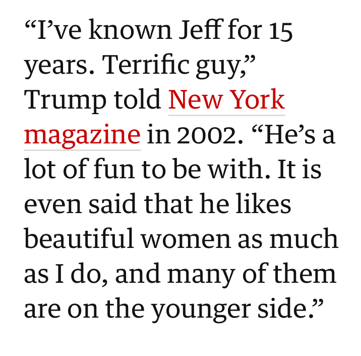 “I’ve known Jeff for 15 years. Terrific guy,” Mr. Trump told New York magazine in 2002. “He’s a lot of fun to be with. It is even said that he likes beautiful women as much as I do, and many of them are on the younger side. No doubt about it — Jeffrey enjoys his social life.”
