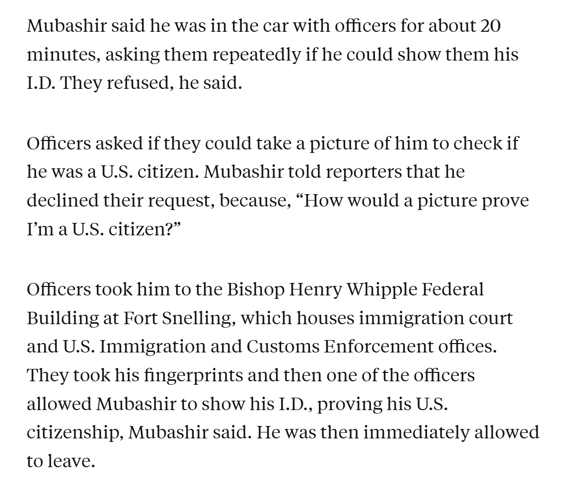 Nasra Ahmed, 23, was walking through the parking lot of her aunt’s St. Paul apartment complex when she found herself surrounded by 12 agents. Ahmed, born in the USA, says she showed them her I.D. She was forcefully detained and jailed anyway for more than 2 days. www.twincities.com/2026/01/18/s...