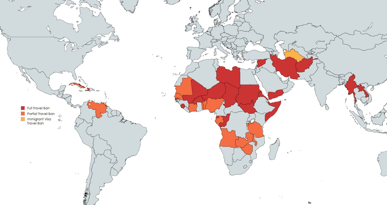 Here is a map of the affected countries (excluding Tonga), to give you a sense of how much this new ban restricts immigration from Africa in particular.