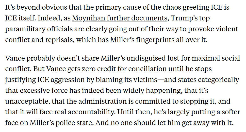 Greg Sargent(gregsargent.bsky.social): It`s now very clear that JD Vance is consciously taking on the role of putting a softer face on Stephen Miller`s fascism. Vance is becoming chief propagandist for ICE`s violent paramilitary warfare against Americans.