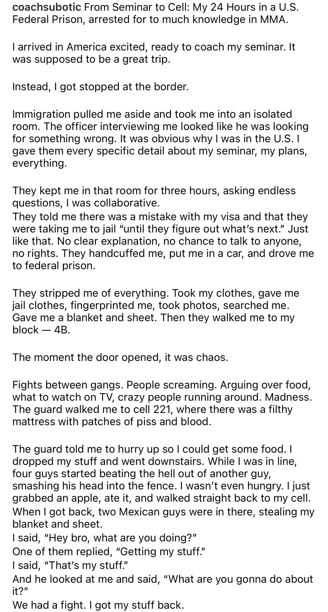 A well-respected MMA coach who always posts training tips and is based out of Australia says he arrived in the U.S. for an already-scheduled seminar, but was detained at the border, thrown in a federal prison and ultimately deported.