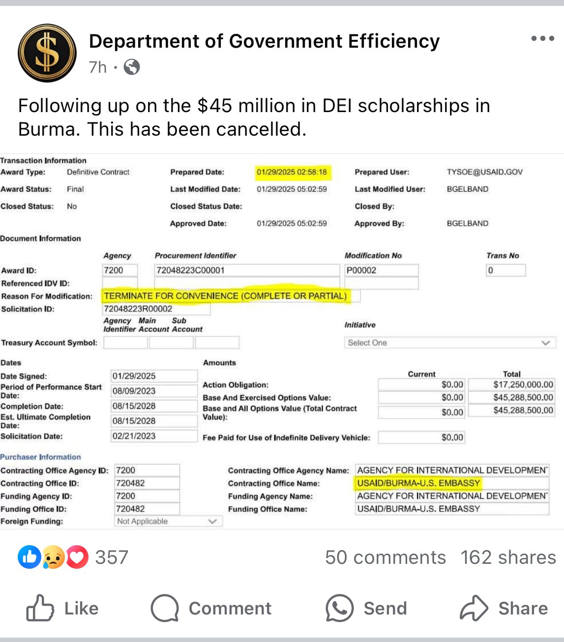 So the DOGE bros are bragging today that they got "DEI scholarships for Burma" canceled.