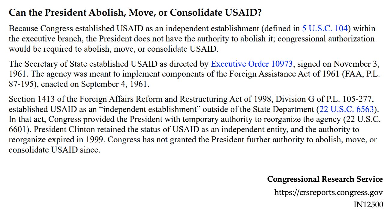 Here is United States law regarding the President's attempts to close our development assistance agency in secret over the weekend.