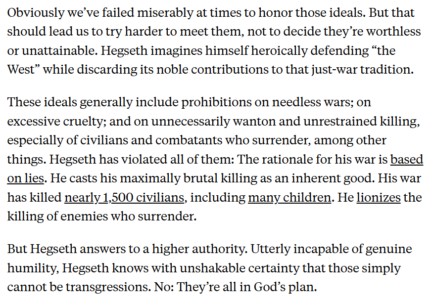 Greg Sargent(gregsargent.bsky.social): Hegseth imagines himself defending “Western civilization.“ But the West has also made important contributions to the idea that there are moral limits on what we can do in war, from Cicero through Augustine, Grotius, Kant and more. He discards this inheritance. 6/
