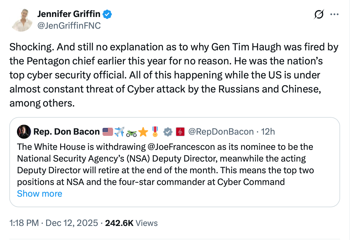 Imagine you’re Timothy Haugh, a decorated general, confirmed unanimously by the Senate to head the NSA. And while you’re traveling abroad, you find out the President just fired you on the advice of a 9/11 truther whose bigotry once got her banned by Uber.