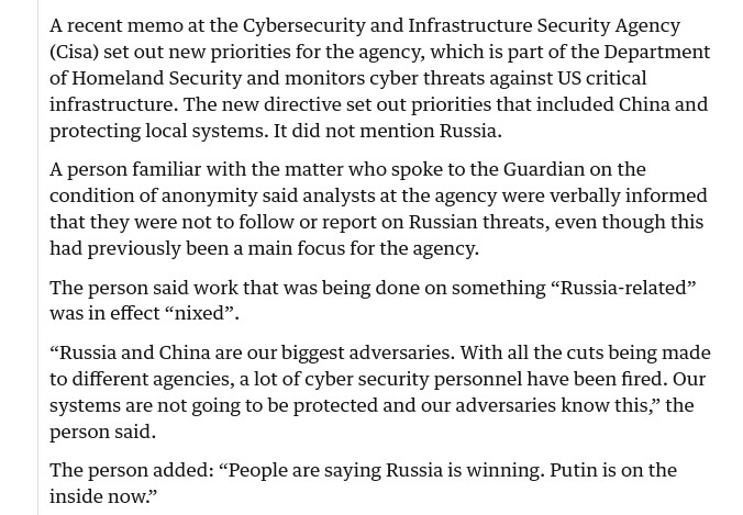 The context: this ties to a Trump decision dating to the first 72 hours of his administration to stand down all cybersecurity operations targeting Russia, creating an open gap for Russian influence operations.