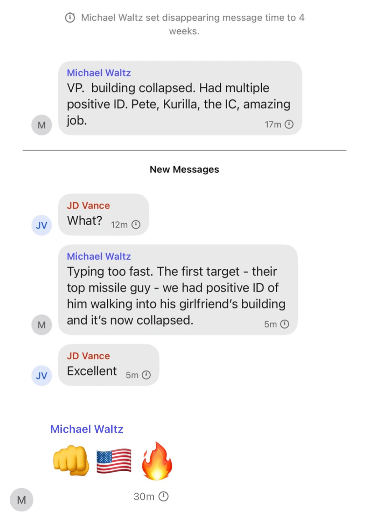 As I said in the thing I wrote yesterday, the way the chat begins makes it very, very clear this is a routine thing they do all the time. Nobody acts as though there’s anything remotely odd or new about convening a military planning session on a commercial app. Nobody so much as remarks on it.