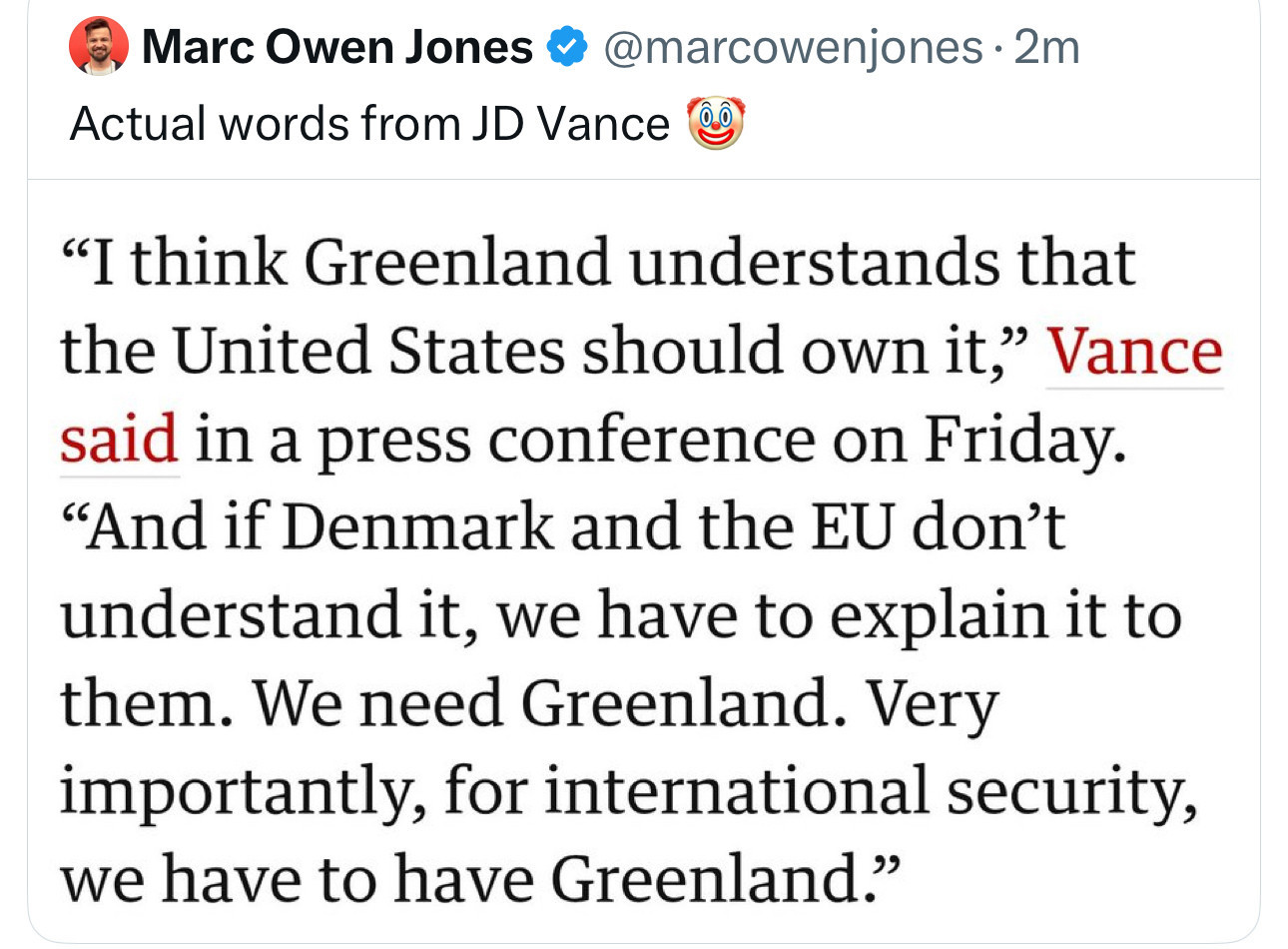 Aaron Rupar (atrupar.com): JD Vance: "The president has said clearly he doesn't think that military force is going to be necessary, but he absolutely believes that Greenland is an important part of the security not just of the US but of the world and of course the people of Greenland too ... this has to happen."