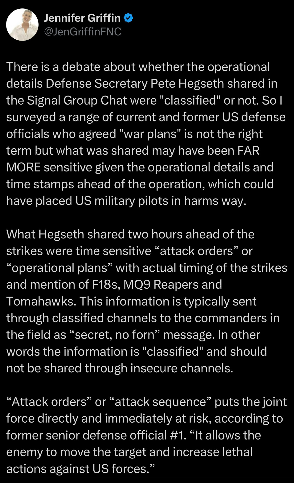 Scott Shapiro (scottjshapiro.bsky.social): Everyone is blaming Waltz, but why did no one—not even the Director of National Intelligence Tulsi Gabbard—say that they should not be discussing classified information on Signal. (link)