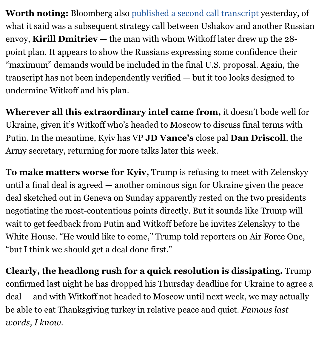 It looks like Trump has backed off his Thanksgiving deadline for getting Ukraine to surrender but Democrats need to let Americans know the fix is in. Putin is calling in all his debts and Jared is there to pay him off. (archive.ph)
